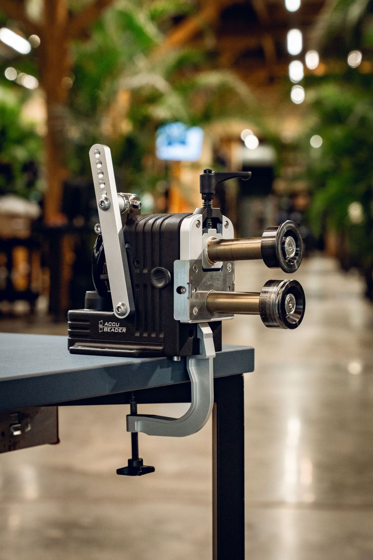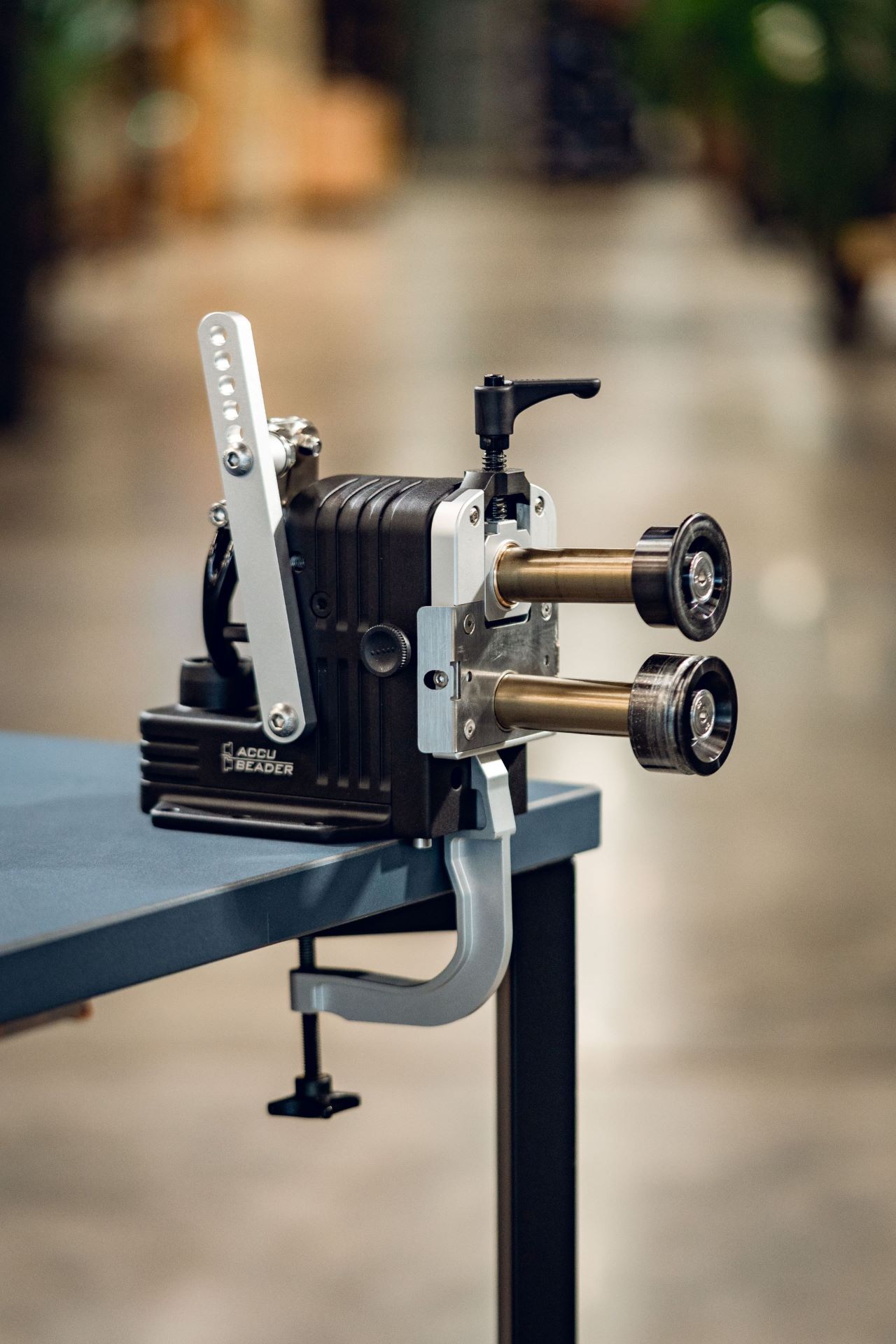 Accubeader, pedál, vyměnitelné válce pro různé prolisy a úkony, stolní držák, doraz a podpůrnou polici.